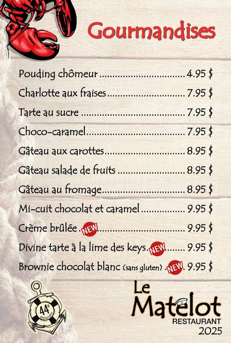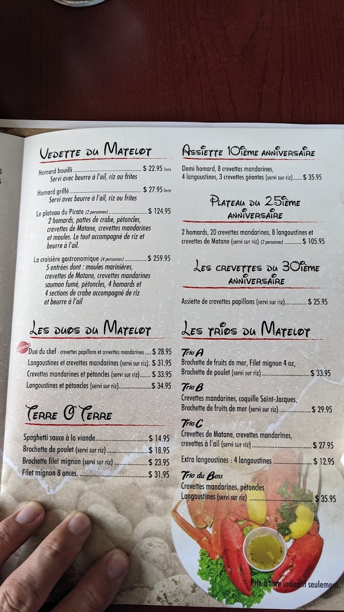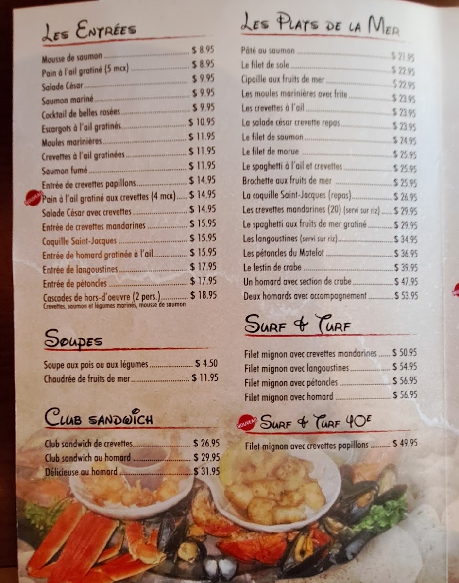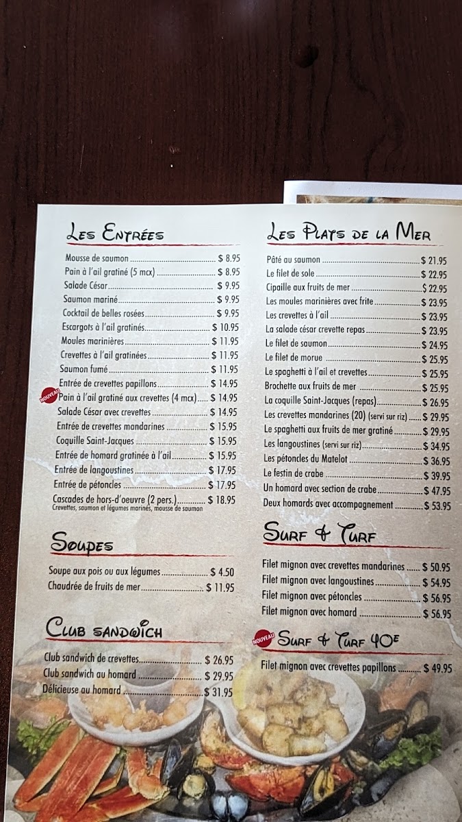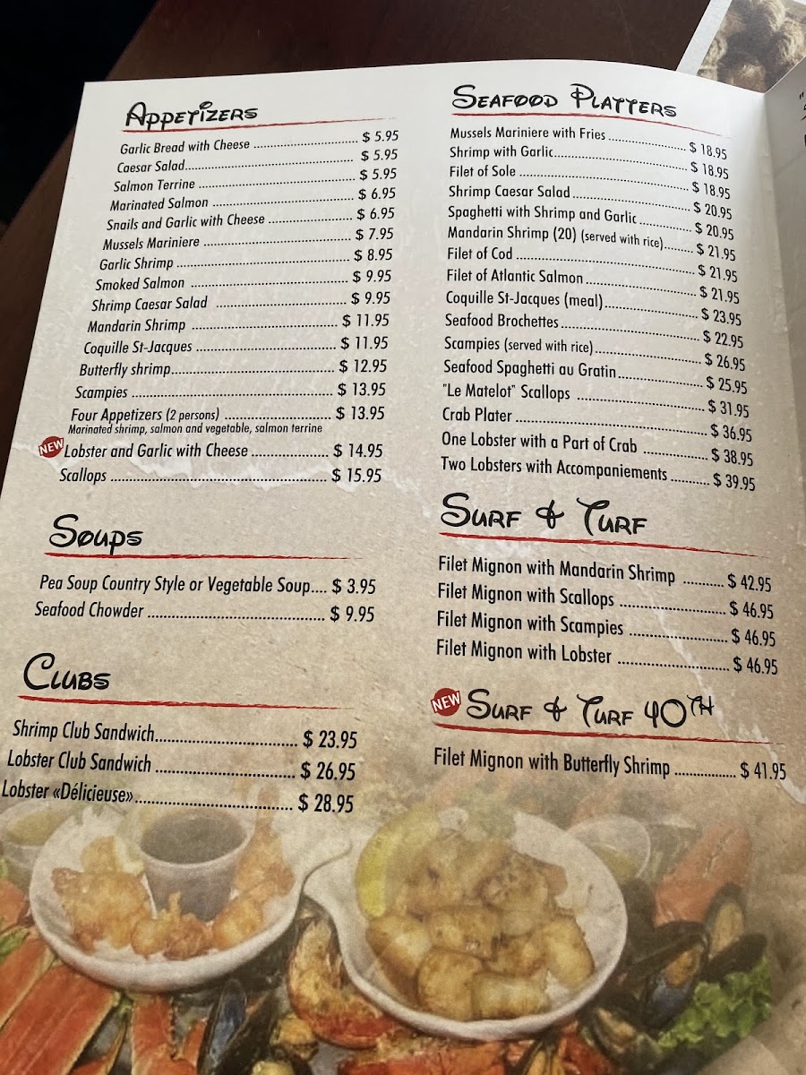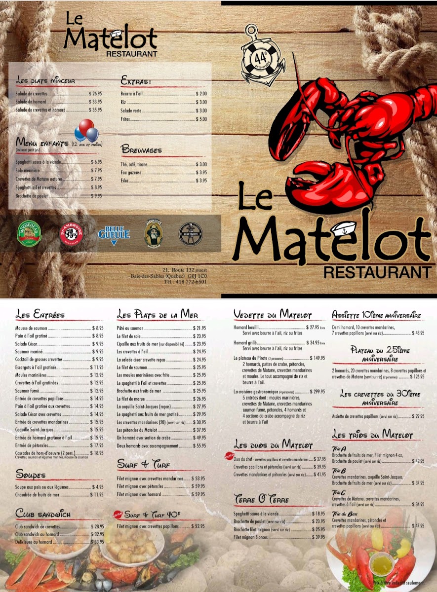 Restaurant Le Matelot is a hidden gem located in Baie-des-Sables, Quebec, renowned for its impressive seafood offerings. The menu features a wide array of seafood platters, including the famous Crab Platter, Mandarin Shrimp, and the exquisite Filet of Atlantic Salmon. For pasta lovers, their Seafood Spaghetti Au Gratin and Spaghetti with Shrimp tantalize the taste buds.